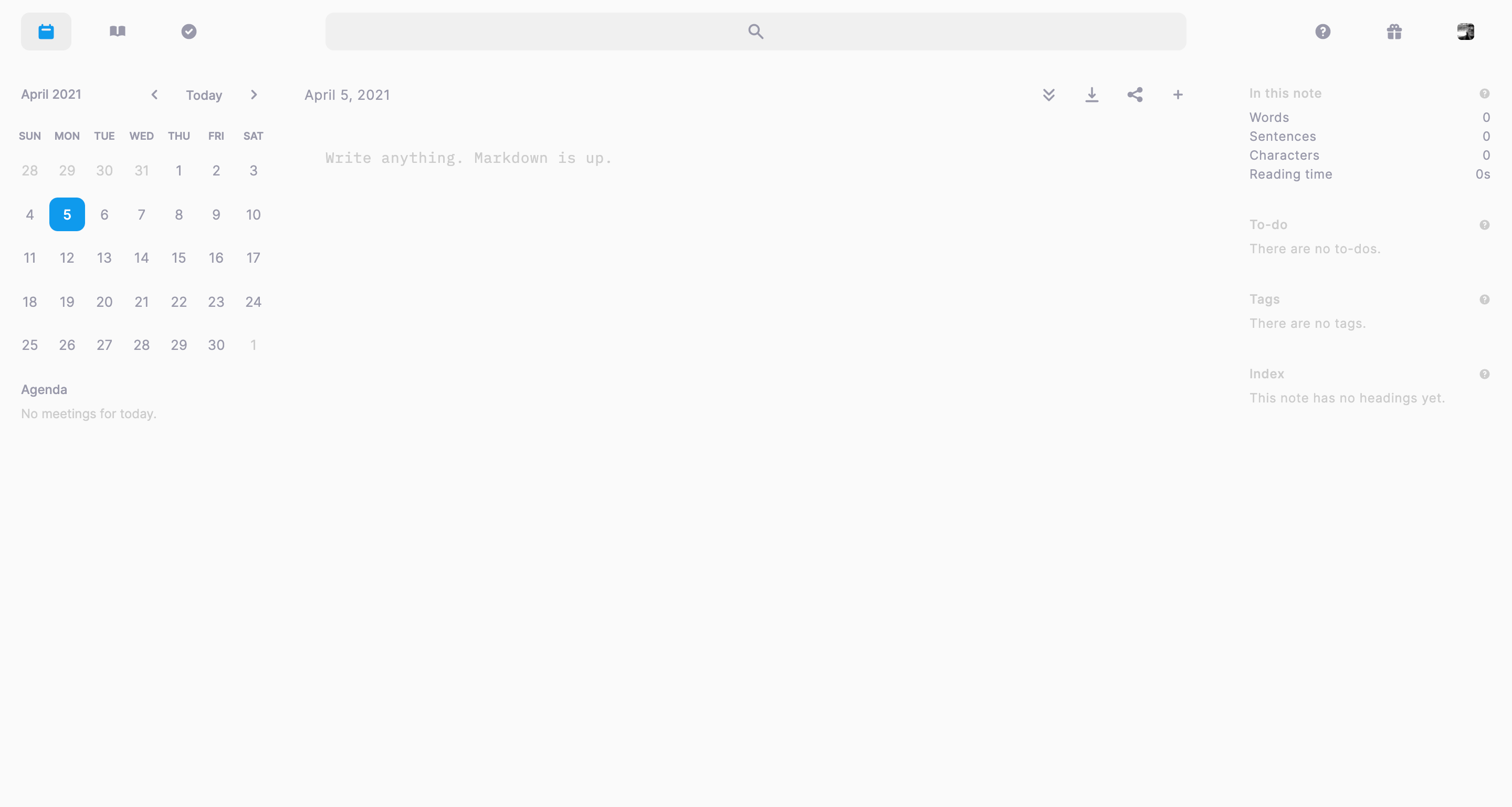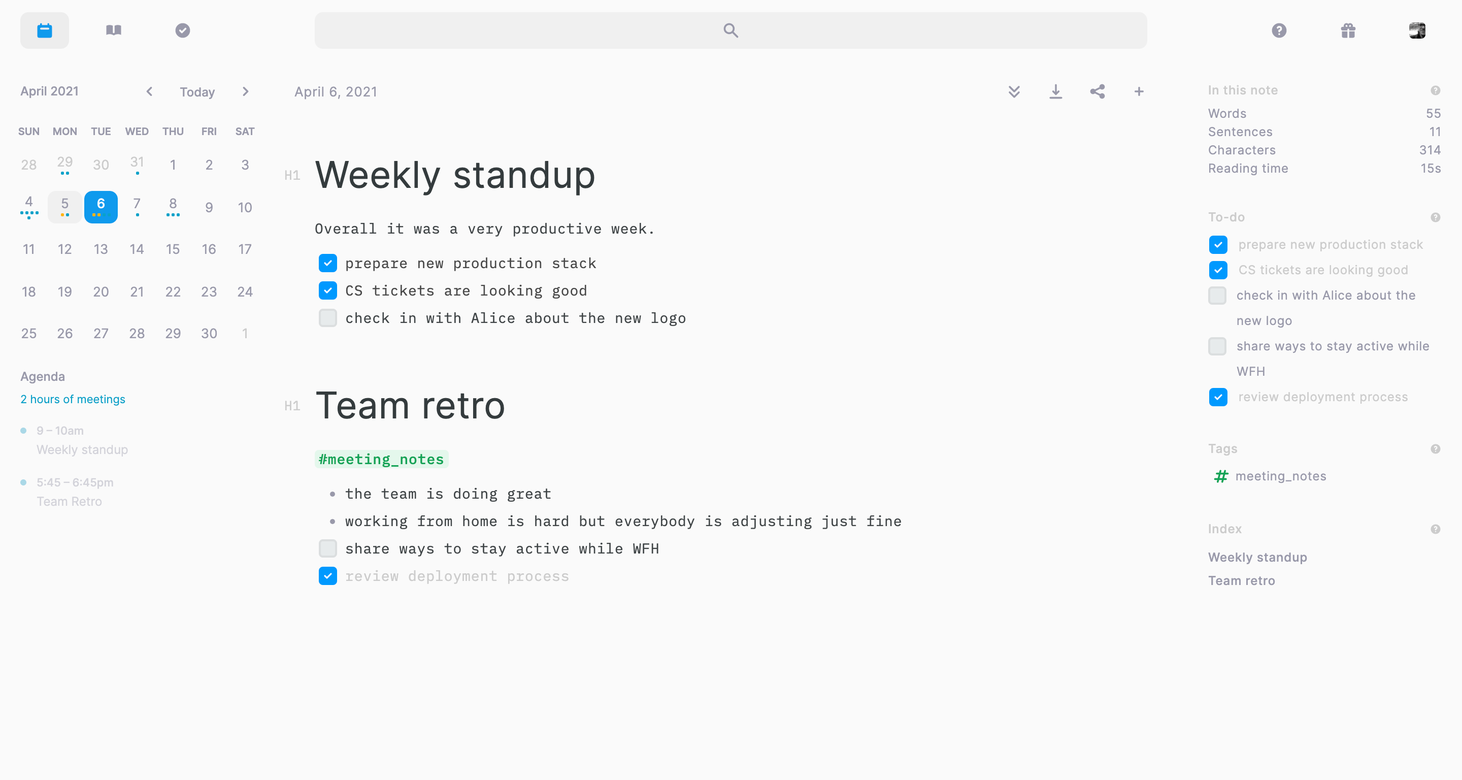 In the agenda every note is tied to a date, and you can see your daily schedule straight from your calendar, create quick meeting notes, and manage your todos.