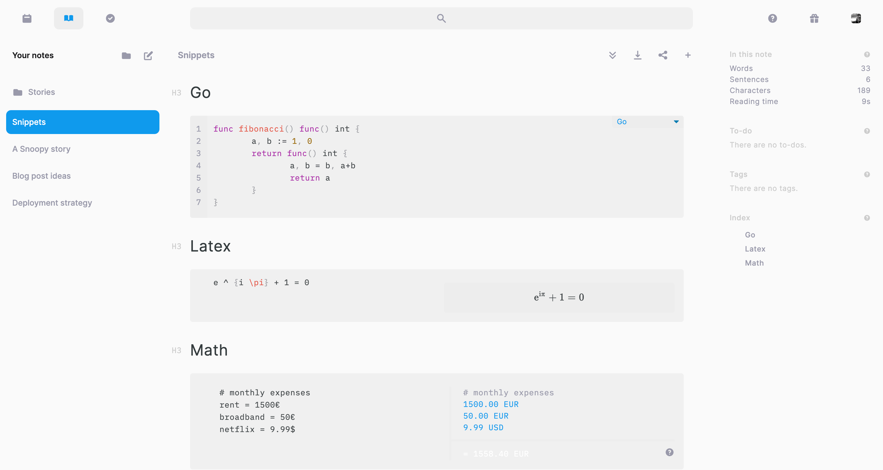 Code syntax highlighting, inline LaTeX formulas, images and captions, sketches and diagrams make Washi a great tool for taking complex notes, tackling classes, designing projects, and never losing any piece of content.